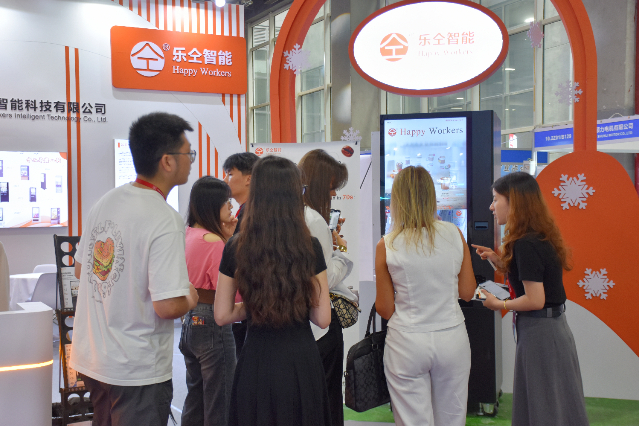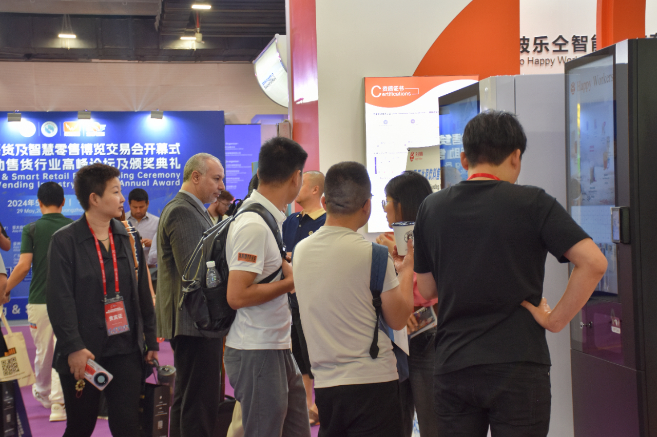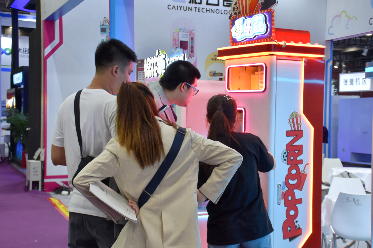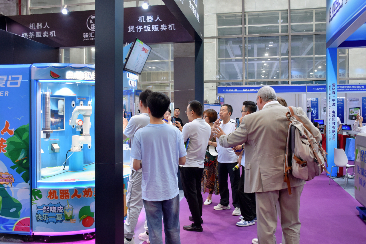 現場展示了自動制作咖啡、奶茶、爆米花、棉花糖、冰激凌、煲仔飯等餐飲產品的無人零售機器。